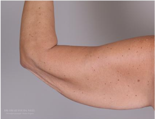 This is a 25-year-old woman who after losing 85lbs was left with a lot of excess skin, including on her arms. A brachioplasty was performed